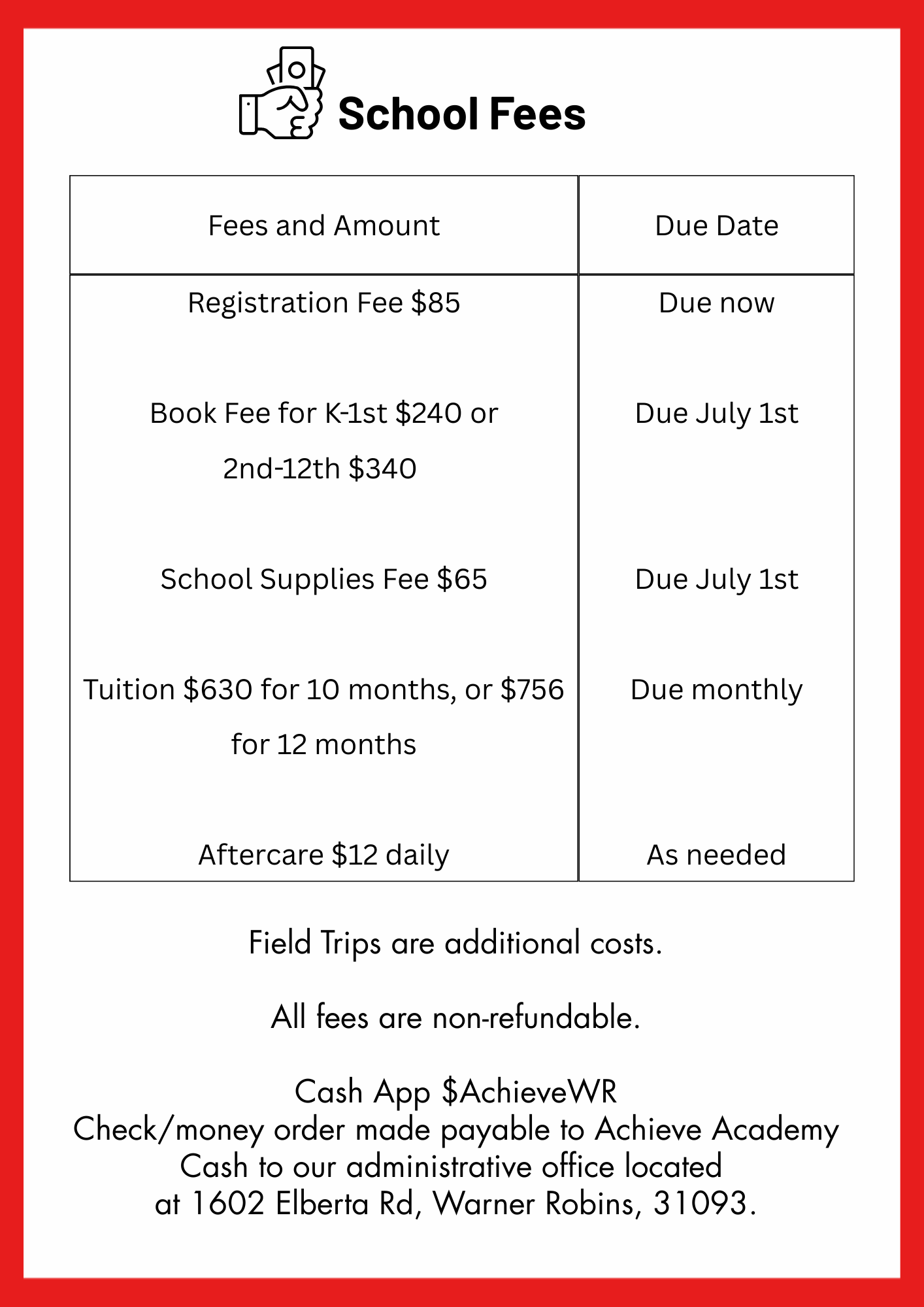 Submit registration fee of $85 by Cash app to $AchieveWR, in cash, or by check to Achieve Academy.